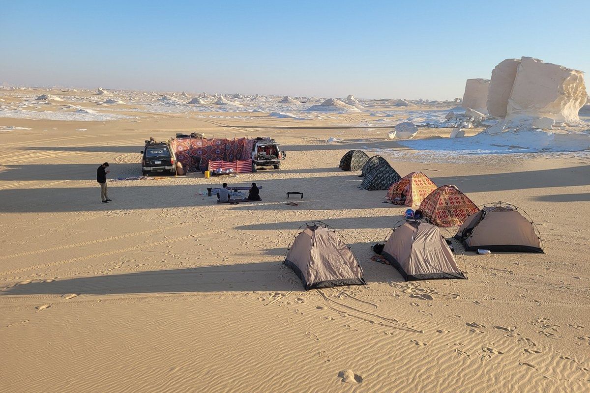 ▪️ Continue driving to the white desert protectorate to see the distinctive rock formations shaped in the form of giant mushrooms or pebbles is unequaled in any desert in the world or even camel and chicken.